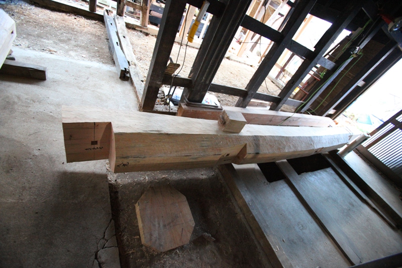 いよいよ受け梁と天秤梁の加工が終わり後は組むのみとなりました。どの様になるかとても楽しみです。 |