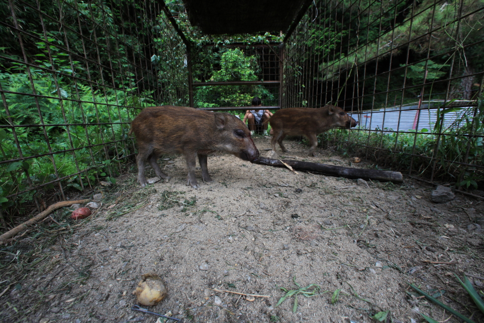 地元の猟友会の協力を得て、ピリカの調教が始まりました、猪を攻めて行きました。号令は、飼い主の志帆さんです。 |